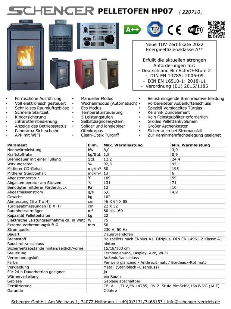 - Neue TÜV-Zertifikate nach der aktuellen Emission Anforderungen 2022, Deutschland BImSchV-Stufe 2, DIN EN 14785: 2006-09, DIN EN 16510-1: 2018-11 und Ecodesign (EU) 2015/1185.