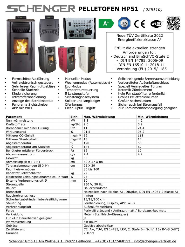 - Neue TÜV-Zertifikate nach der aktuellen Emission Anforderungen 2022, Deutschland BImSchV-Stufe 2, DIN EN 14785: 2006-09, DIN EN 16510-1: 2018-11 und Ecodesign (EU) 2015/1185.