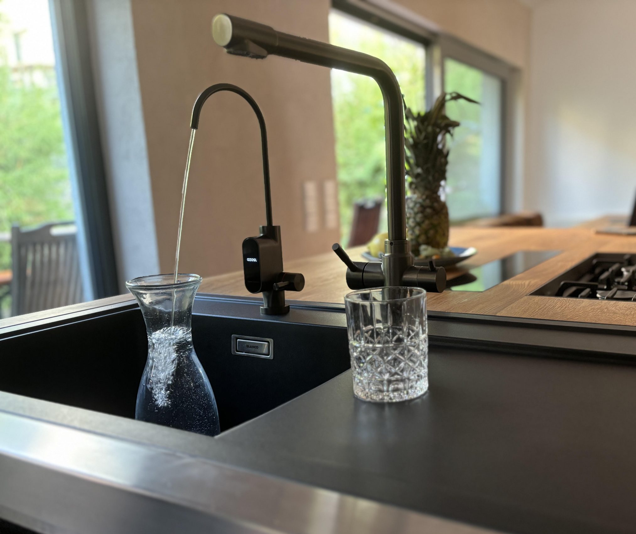 Der Ozon-Wasserhahn OZ-M1-pro wird als System, mit einer Umkehrosmose-Filteranlage, OZ-G3-500, geliefert. Damit ist gewährleistet, dass alle schädlichen Stoffe, die im Leitungswasser möglicherweise vorkommen, wie Schwermetalle, Insektizide, Pestizide, Öle, Kohlenwasserstoffe (auch Bisphenol-A und andere Weichmacher), PFAS (polyfluorierte Alkylverbindungen), radioaktive Substanzen (natürliche, wie Radon und aus Klinikabwässer etc.) eliminiert werden.